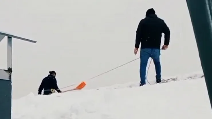 Malatya'nın Yeşilyurt ilçesine bağlı Bostanbaşı Mahallesinde kaydedilen görüntülerde, iki kişinin 14 katlı bir binanın çatısında tehlikeli kar temizliği dikkatlerden kaçmadı. Yoğun kar yağışı ile birlikte birçok çatıda kar çökmelerinin meydana geldiği kentte, cep telefonu kamerasına yansıyan görüntülerde beline bağladığı halat ile çatının ucuna kadar temizlik yapan şahıs yürekleri ağza getirirken, arkadaşı ise ipin ucundan tutarak önlem aldı.
