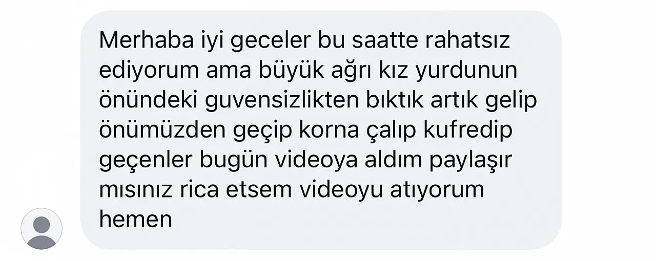 Ağrı'da eğitim gören ve Büyük Ağrı Kız Yurdunda ikamet eden üniversite öğrencilerinin huzuru, bazı sorumsuz sürücüler tarafından bozuluyor. TV04 İhbar Hattına gönderilen mesajda, ismini vermek istemeyen bir öğrenci, özellikle akşam saatlerinde yurt önünde araçlarıyla bekleyen kişilerin, öğrencilere yönelik uygunsuz davranışlarda bulunduğunu ve yüksek sesle korna çalarak rahatsızlık verdiğini dile getirdi. Şikayet, bölgedeki kız öğrencilerin güvenliği ve huzuru açısından endişe yaratıyor.