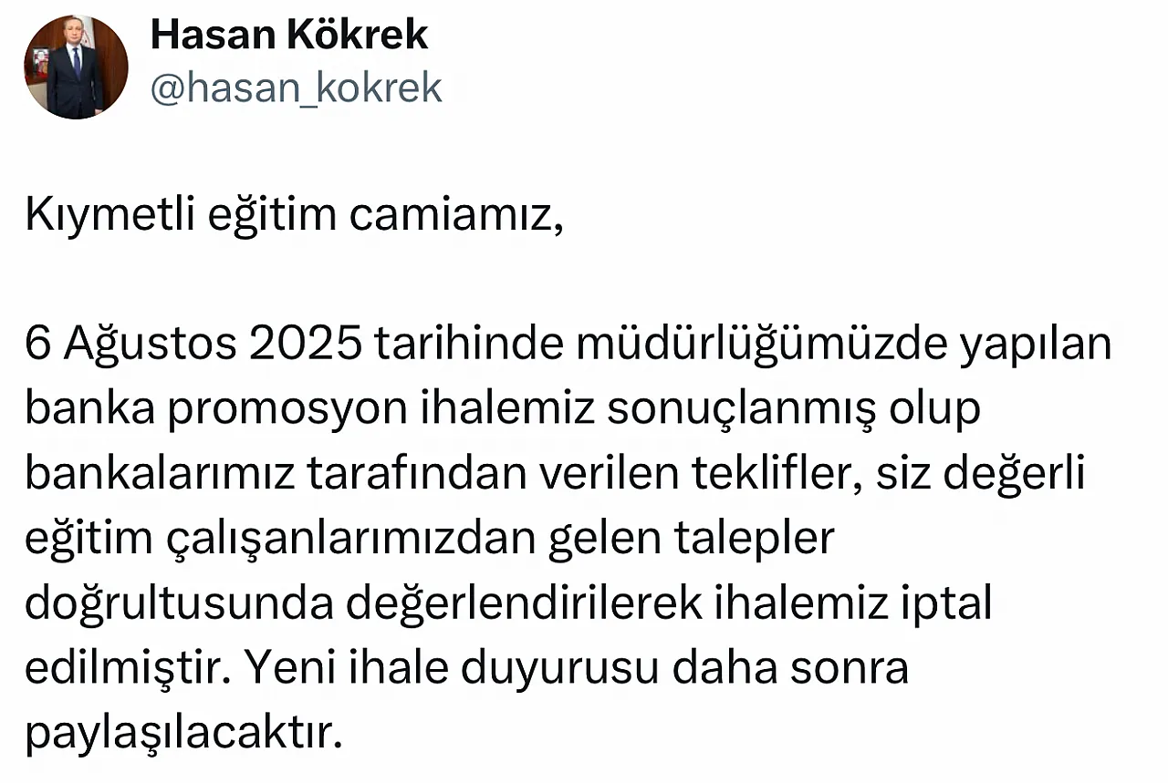 Hasan Kökrek yaptığı açıklamada, “Kıymetli eğitim camiamız, 6 Ağustos 2025 tarihinde müdürlüğümüzde yapılan banka promosyon ihalemiz sonuçlanmış olup bankalarımız tarafından verilen teklifler, siz değerli eğitim çalışanlarımızdan gelen talepler doğrultusunda değerlendirilerek ihalemiz iptal edilmiştir. Yeni ihale duyurusu daha sonra paylaşılacaktır.” ifadelerine yer verdi.