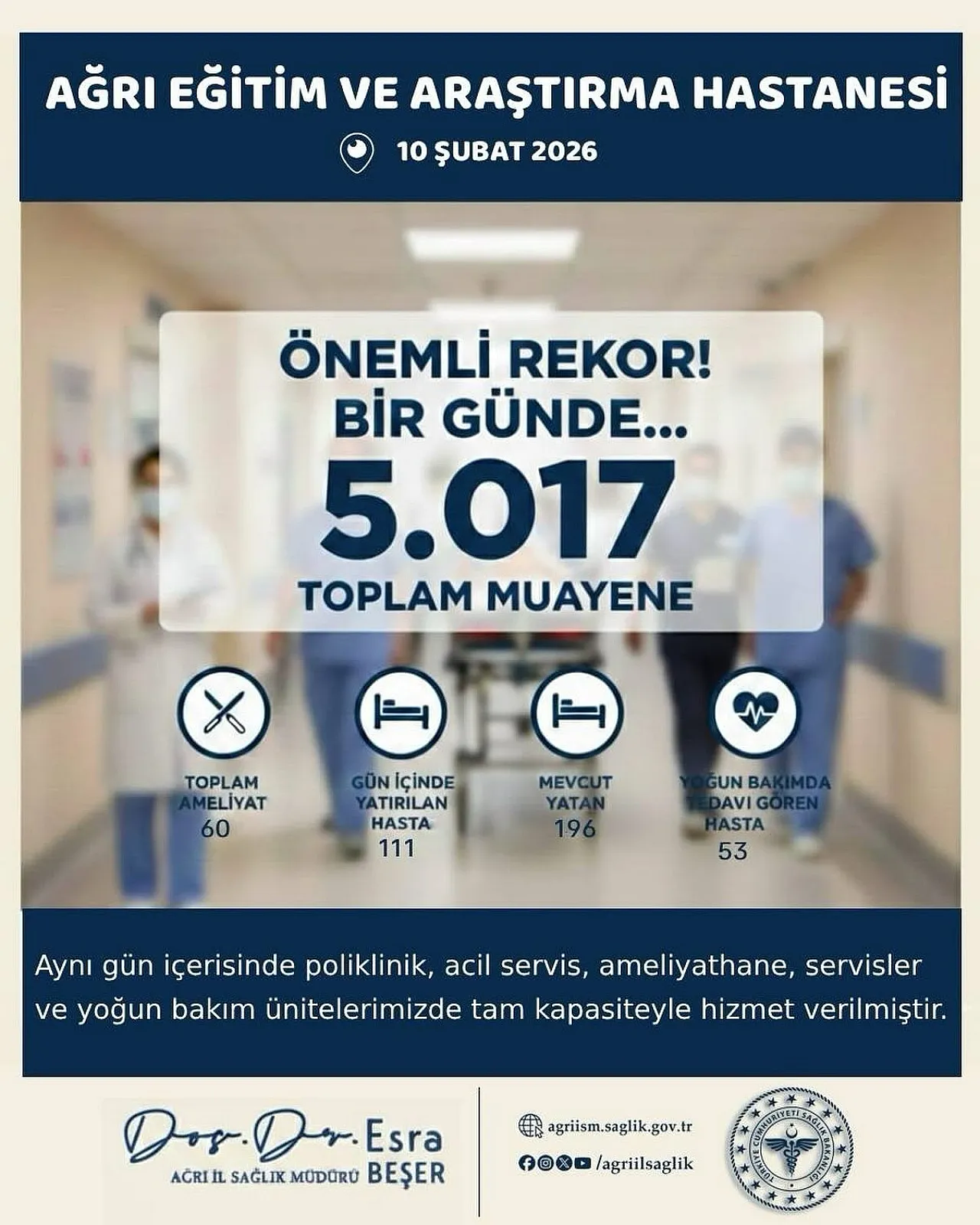 Ağrı İl Sağlık Müdürlüğü’nün paylaştığı verilere göre, sadece bir gün içinde 5 bin 17 kişi muayene edildi. Gün boyunca ameliyathanelerde ışıklar sönmedi; 60 ameliyat başarıyla gerçekleştirildi.