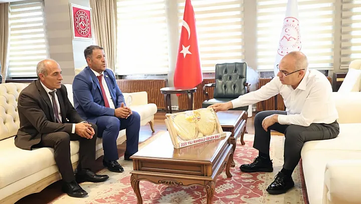 Ağrı Valisi Mustafa Koç, 2025 yılının ilk bal hasadını sunmak üzere kendisini makamında ziyaret eden arıcılar Cihan Altın ve Aslan Aydın'ı ağırladı.