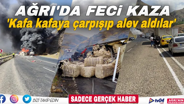 Ağrı Eleşkirt-Erzurum karayolunda kafa kafaya çarpışan çekici ve kamyon alev aldı.