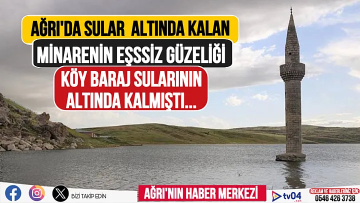 Ağrı’nın merkeze bağlı Başçavuş köyünde yükselen baraj suları altında kalan caminin minaresi, eşsiz güzelliğiyle göz kamaştırıyor.