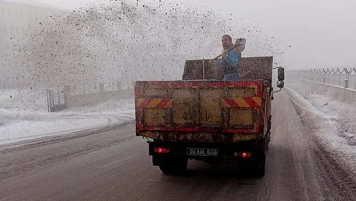 Ağrı'da etkisini gösteren kar yağışı ve soğuk hava koşulları, belediye ekiplerini harekete geçirdi. Şehir genelinde buzlanmaya karşı yol güvenliğini sağlamak amacıyla tuzlama ve kar temizleme çalışmaları aralıksız devam ediyor.