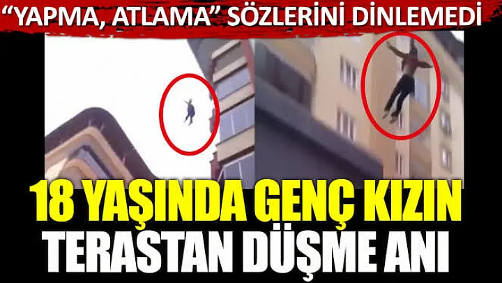 Genç kızın metrelerce yüksekten atladığı anlar bir vatandaşın telefon kamerasına yansıdı. Çevredeki vatandaşların 'Yapma atlama. Sevenlerine yazık' diyerek genç kızı ikna etmeye çalıştığı anlar görüntüye yansıdı. Genç kızın çevredeki vatandaşların dediklerine aldırmadan terastan atlaması amatör bir telefon kamerası tarafından saniye saniye kaydedildi.