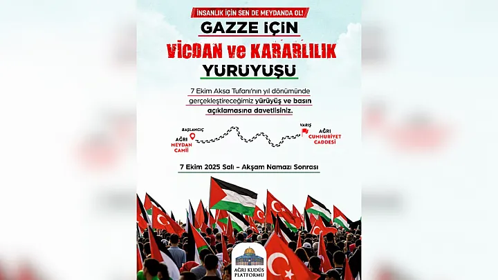 Ağrı Kudüs Platformu, Aksa Tufanı operasyonunun ikinci yıl dönümü dolayısıyla Gazze'ye destek amacıyla kitlesel bir yürüyüş ve basın açıklaması organize ediyor.