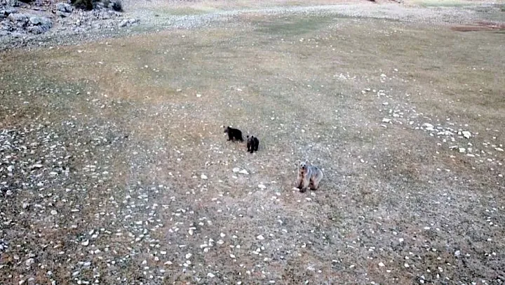 Bir süre sonra suyun aktığı dereye gitmek için yol alan ayı ailesi uzaktan insanları fark ettiler. Bunun üzerine havadan da görüntülenen ayı ailesi dronu tehlike olarak algılayarak ağaçlık alana doğru uzaklaştılar.