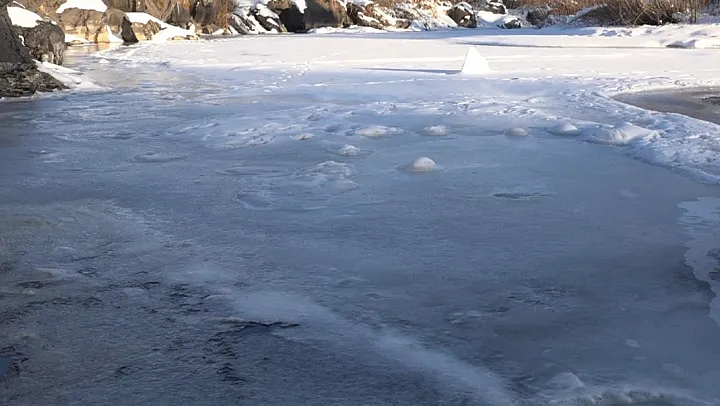 Van'ın Erciş ilçesinde inci kefali balığı göçünün en güzel şekilde izlendiği Deli Çay, soğuk hava nedeniyle buzla kaplandı.
