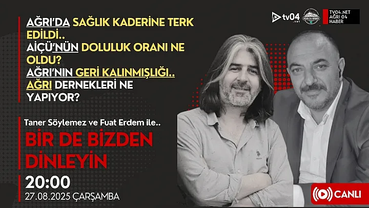 27 Ağustos 2025 Çarşamba günü saat 20.00'de, TV04 ve Ağrı 04 Haber ortak yapımıyla ekrana gelecek olan 'Bir de Bizden Dinleyin' programında, kentin en önemli sorunları tartışılacak.