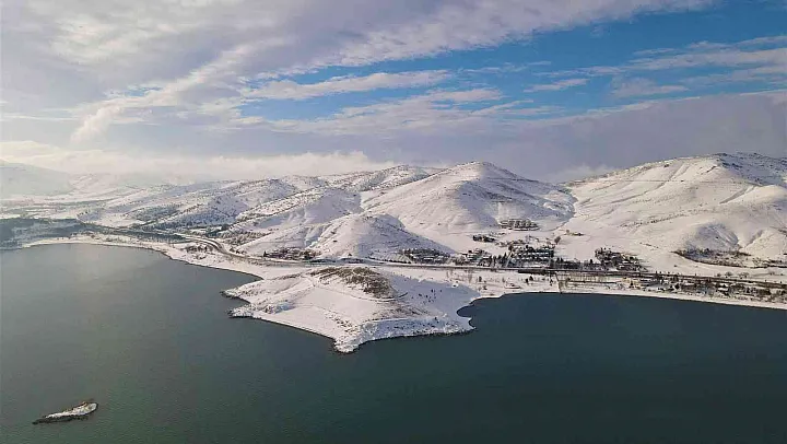 Elazığ'da doğunun gizli denizi olarak bilinen Hazar Gölü'nde kış güzelliği, seyrine doyum olmayan manzaralar sunuyor.