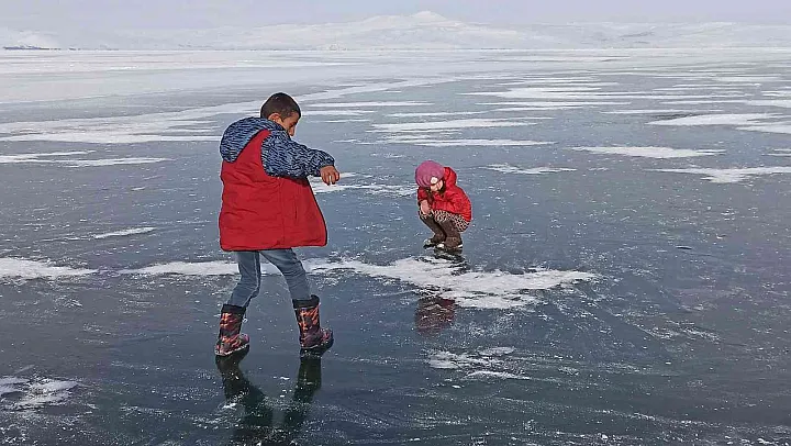 Bitlis'in Ahlat ilçesinde bulunan ve şiddetli soğuklarla donan Nazik Gölü, köy çocuklarının oyun alanı oldu.