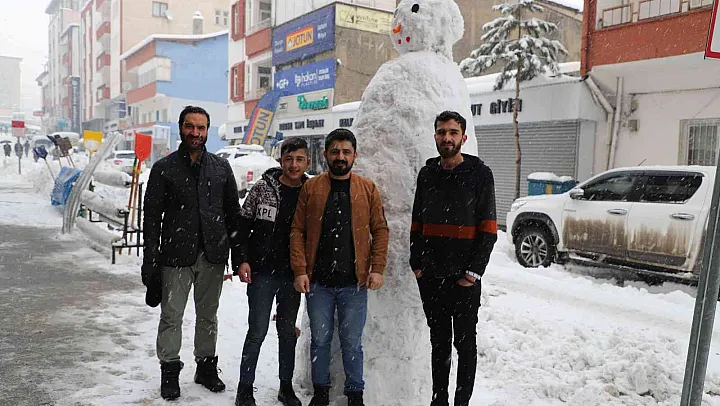 Hakkari'de kar yağışını fırsat bilen bir grup esnaf, yaklaşık 2 metre boyunda kardan adam yaptı.