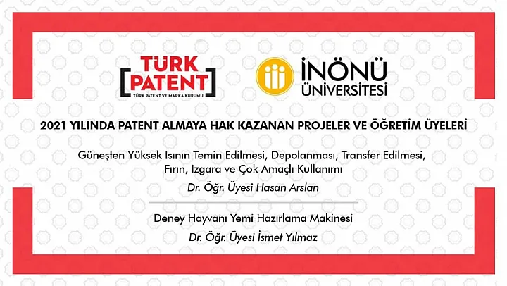 İnönü Üniversitesi Eczacılık Fakültesi öğretim üyesi Dr. Öğr. Üyesi İsmet Yılmaz ve öğretim üyesi Dr. Öğr. Üyesi Hasan Arslan'ın yaptıkları bilimsel araştırma projelerine 2021 yılı içerisinde Türk Patent ve Marka Kurumu tarafından Patent Belgesi verildi.