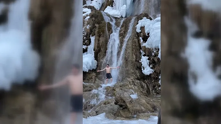 Erzincan'da doğa sevdalısı Selim Özgün, İskandinav kültürüne özenerek buz gibi akan Girlevik Şelalesi'nin altına girdi.