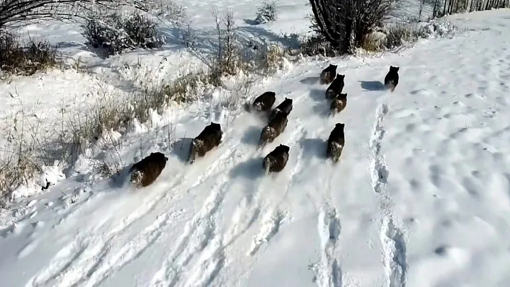 Karlı arazide ilerleyen domuz sürüsü havadan görüntülendi