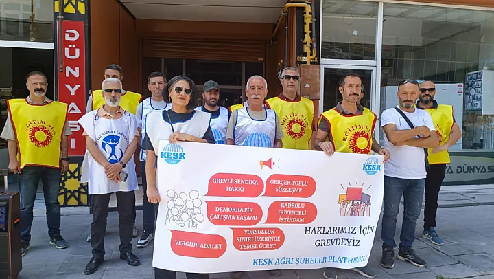 Kamu Emekçileri Sendikaları Konfederasyonu'na (KESK) bağlı sendika üyeleri, hükümetin kamu emekçilerine sunduğu toplu sözleşme teklifini protesto etmek amacıyla Ağrı'da greve çıktı. 'Kapı kulu değil, emekçiyiz' sloganıyla alanlara çıkan emekçiler, sefalet ücretini kabul etmeyeceklerini vurguladı.