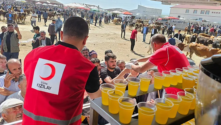 Kurban Bayramı öncesi Ağrı Hayvan Satış Pazarı'nda vatandaşlarla buluşan Kızılay Ağrı Şubesi, besicilere ve kurbanlık almaya gelenlere limonata ve kek ikramında bulunarak sıcak havada serinlik ve moral sağladı.