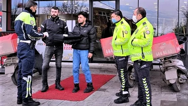 Erzincan'da Trafik Tescil ve Denetleme Şube Müdürlüğü tarafından kuryelere kış şartlarında motosiklet kullanımı hakkında bilgilendirme yapıldı.