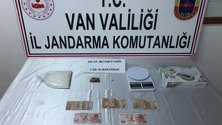 Edinilen bilgiye göre, Muradiye İlçe Jandarma Komutanlığı ekipleri aldıkları bir duyum üzerine 12 Şubat günü saat 23.00 sıralarında durdurdukları bir ticari takside bulunan R.K. isimli yolcunun valizinde 394 gram metamfetamin, yaklaşık 3 gram kubar esrar, 170 dolar sahte para ile 1 adet hassas terazi ele geçirdi. Gözaltına alınan şahıs, işlemlerinin ardından adli makamlara sevk edildi.