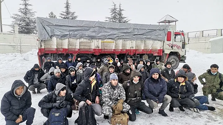 Van'ın Muradiye ilçesinde şüphe üzerine durdurulan kamyonun kasasında 62 düzensiz göçmen yakalandı.