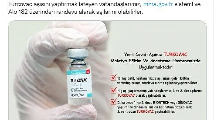 Malatya Eğitim ve Araştırma Hastanesi sosyal medyasında yapılan paylaşımda, 'Yerli aşımız Turcovac, Hastanemizde uygulanmaya başlandı. Turcovac aşısını yaptırmak isteyen vatandaşlarımız, mhrs.gov.tr sistemi veya Alo 182 üzerinden randevu alarak aşılarını olabilirler' denildi.