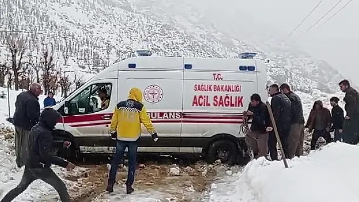 Yolda mahsur kalan ambulansı köylüler kurtardı
