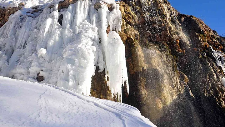 Yüksekova'da kar yağışından sonra etkili olan dondurucu soğuklarla, Doski Vadisinde bulunan şelale görsel şölen oluşturdu. 10 metreyi bulan buz sarkıtlarının oluştuğu şelale doğa ve fotoğraf tutkunlarına görsel şölen sunarken, köydeki vatandaşlar da şelaleyi görmeye gidiyor. Bölgede yaz mevsiminde piknik yapan vatandaşların en çok uğradığı gözde meknlardan biri olan şelale, kışın da soğuk hava ile birlikte oluşan buz sarkıtlarıyla ziyaretçilerine keyifli anlar yaşatıyor. Vatandaşlar soğuk havaya aldırış etmeden Doski Vadisinde bulunan şelaleye gelerek bir yandan geziyor, bir yandan da bol bol fotoğraf çektirerek o anı ölümsüzleştiriyor.