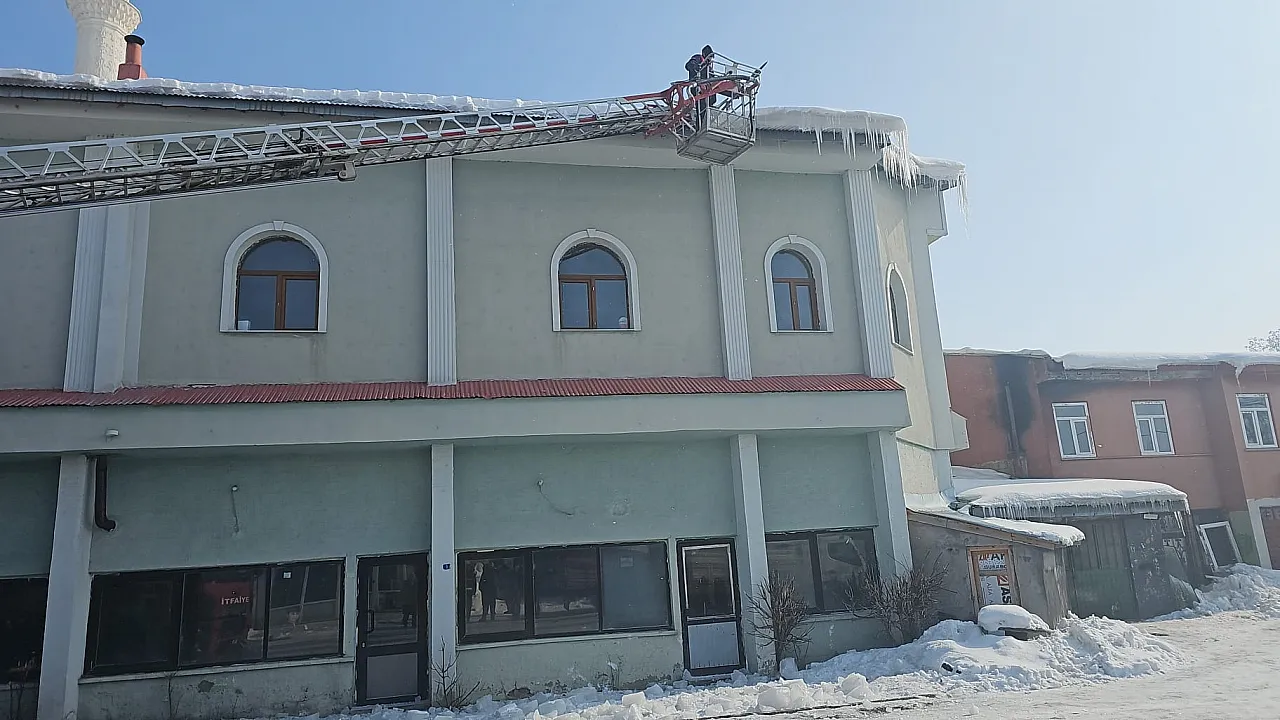 Ağrı'da etkili olan dondurucu soğukların ardından okul ve cami binalarında oluşan buz sarkıtları, itfaiye ekiplerinin müdahalesiyle temizlendi.