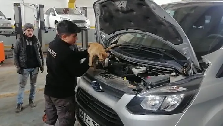 Malatya'da soğuk havadan etkilenen yavru bir kedi, ısınmak için girdiği aracın motorunda kilometrelerce yolculuk yaptıktan sonra aracın bakım için servise gitmesiyle fark edildi. Yavru kedi bulunduğu yerde kalmak için uzun süre direndi.