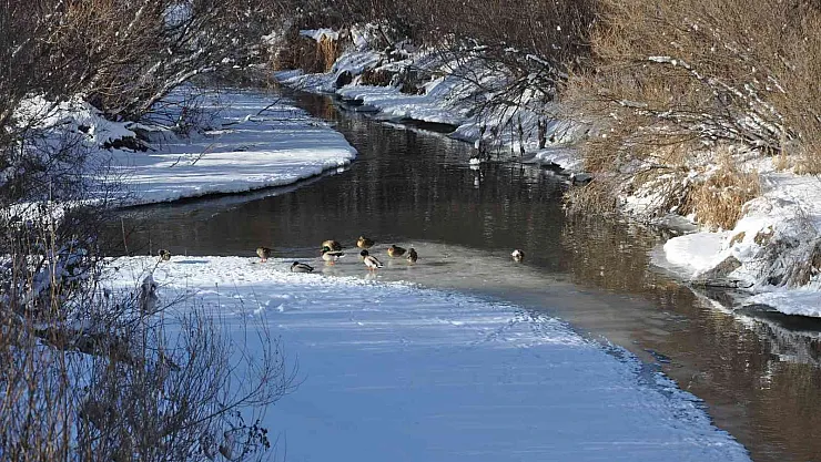 Kars'ta aşırı soğuklardan dolayı büyük çoğunluğu tamamen donan Kars Çayı'nın açık kalan bölgeleri yaban ördeklerine ev sahipliği yapıyor.