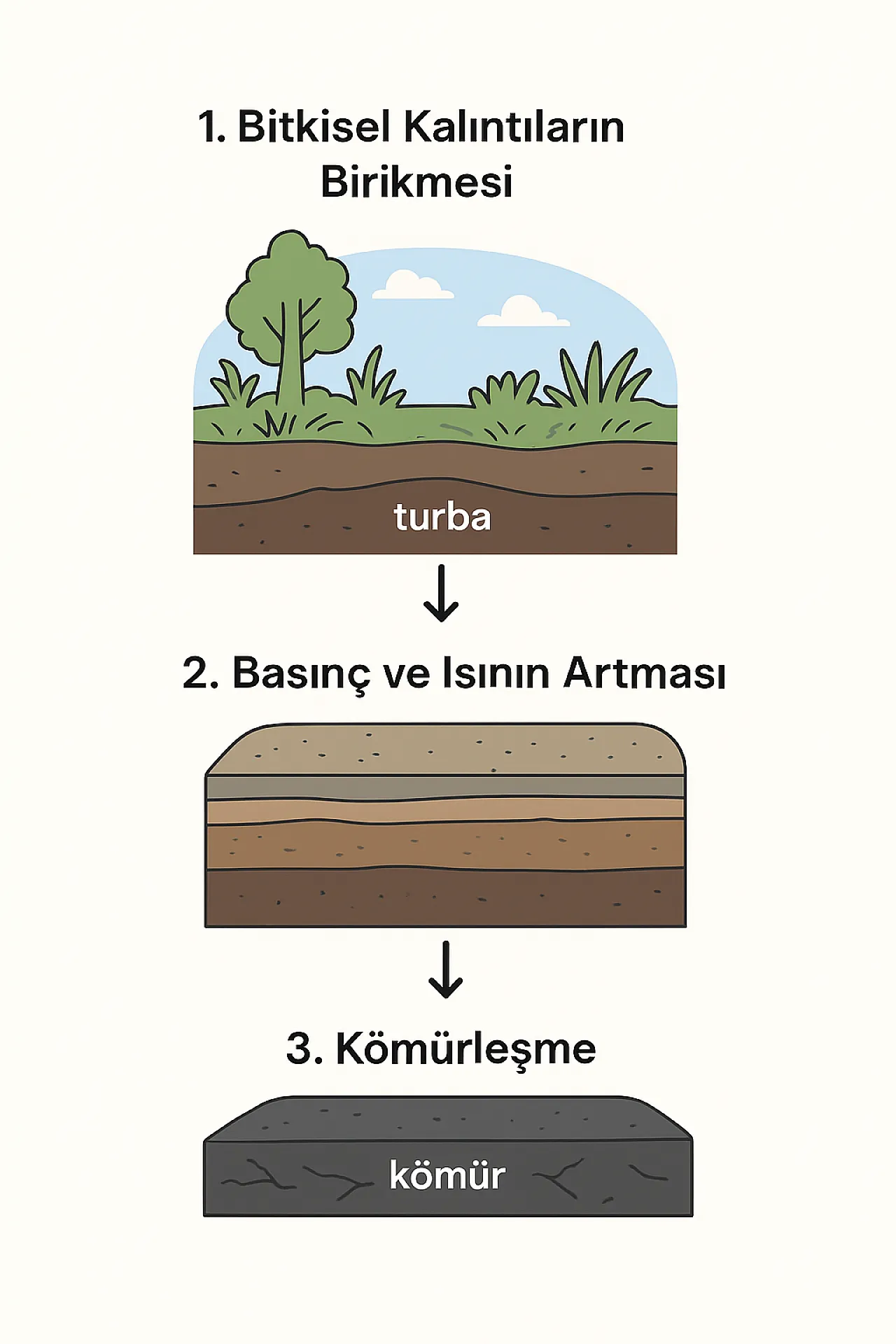 Zamanla, bu ölü bitki ve ağaç kalıntıları (özellikle karbon, hidrojen ve oksijen bileşenlerinden oluşan organik maddeler) üst üste yığılarak birikti. Bu ilk aşamada oluşan ve tam bir kömür sayılmayan maddeye Turba (Peat) adı verilir. Turba, kömürleşme (coalification) sürecinin ilk basamağıdır ve karbon oranı nispeten düşüktür.