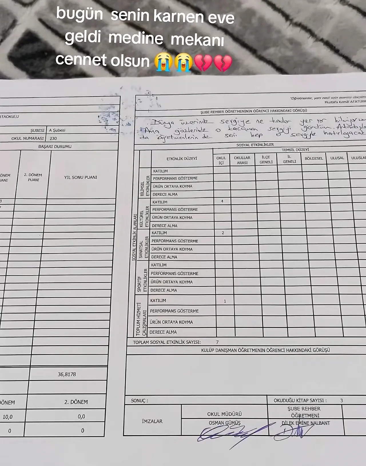 Karne günü, sınıf arkadaşları karnelerini alırken Medine’nin sırası boş kaldı. Ancak öğretmeninin kaleme aldığı o birkaç satır, Medine Şener’in sevgi dolu hatırasını yaşatmaya yetti.