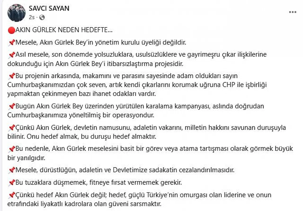 Savcı Sayan, sosyal medya üzerinden yaptığı açıklamada, asıl meselenin Akın Gürlek'in görevi olmadığını vurguladı. Sayan, "Asıl mesele, son dönemde yolsuzluklara, usulsüzlüklere ve gayrimeşru çıkar ilişkilerine dokunduğu için Akın Gürlek Bey’i itibarsızlaştırma projesidir," ifadelerini kullandı.