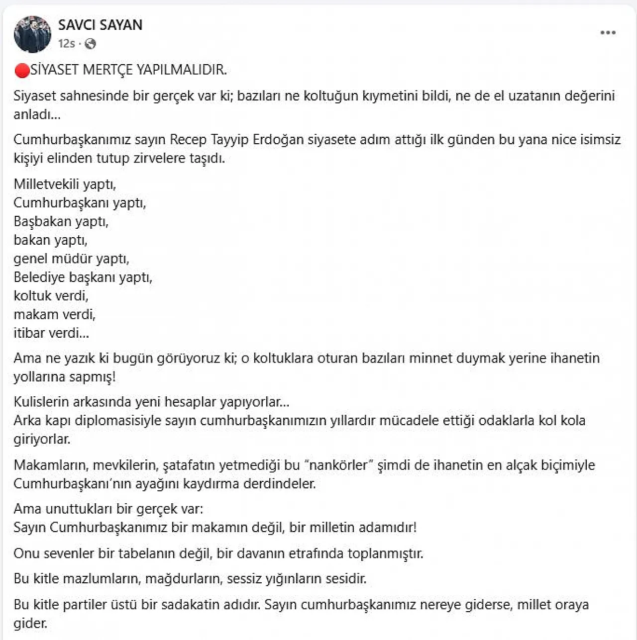 Ağrı eski Belediye Başkanı Savcı Sayan, Cumhurbaşkanı Recep Tayyip Erdoğan'ın desteğiyle önemli makamlara gelen bazı isimleri hedef aldı. Sayan, bu kişileri "koltuğun kıymetini bilmemek", "nankörlük" ve "ihanet" ile suçlayarak, kulis faaliyetleriyle Erdoğan'ın ayağını kaydırmaya çalıştıklarını öne sürdü.