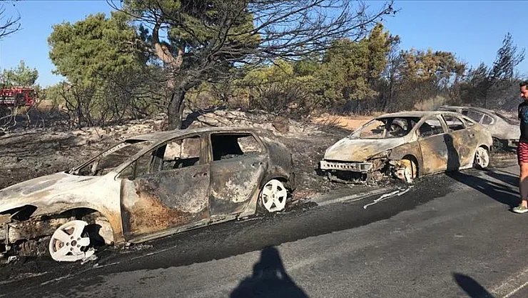 Öte yandan, yangın alanının yakınında bulunan plaja denize girmek için gelenlerin araçları da yangından etkilendi.