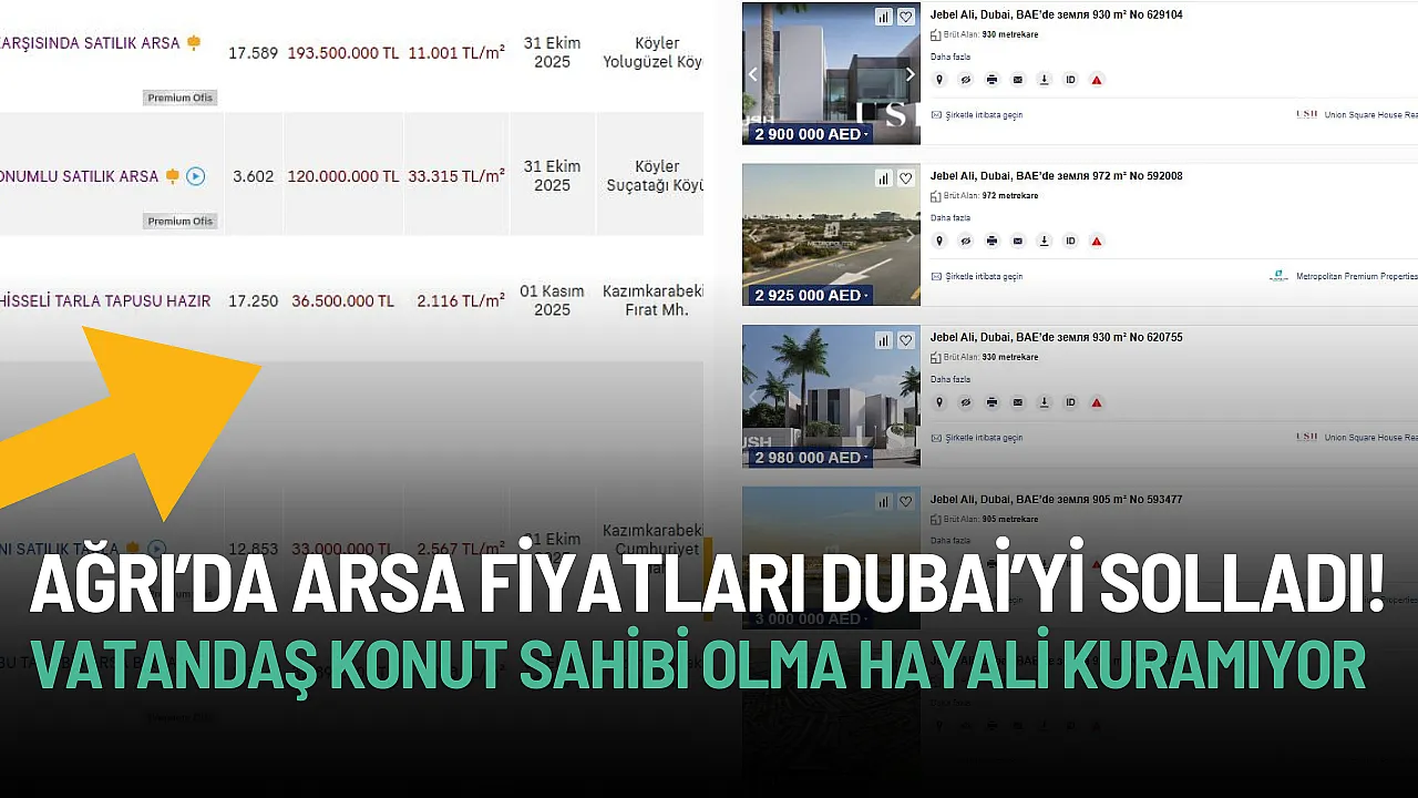 Gayrimenkul ilan sitelerinden elde edilen verilere göre, Ağrı'daki arsa fiyatları, yatırımcıları ve yerel halkı şaşkına çeviren seviyelere ulaştı. Yapılan karşılaştırmalar, Ağrı'nın bazı bölgelerindeki arsa değerlerinin, Dubai'nin merkezi lokasyonlarındaki benzer büyüklükteki arsaların fiyatlarını geçtiğini gösteriyor: