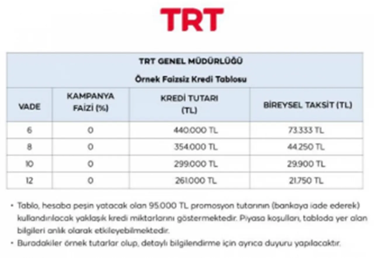 Banka promosyonunu tercih etmeyen TRT personeli için de özel bir imkan sunuldu. Bu çalışanlara, 6, 8, 10 ve 12 ay seçenekli sıfır faizli kredi kullanma fırsatı tanınacak. Bu esneklik, promosyon almak istemeyenler için önemli bir alternatif oluşturuyor.